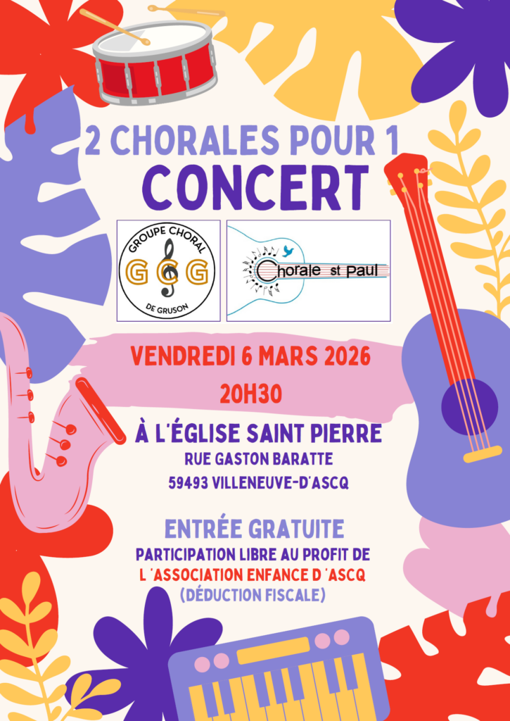 La Chorale Saint Paul et le Groupe Choral de Gruson vous invitent à leur concert au profit de l’association l’ENFANCE D’ASCQ (voir ci-dessous)
